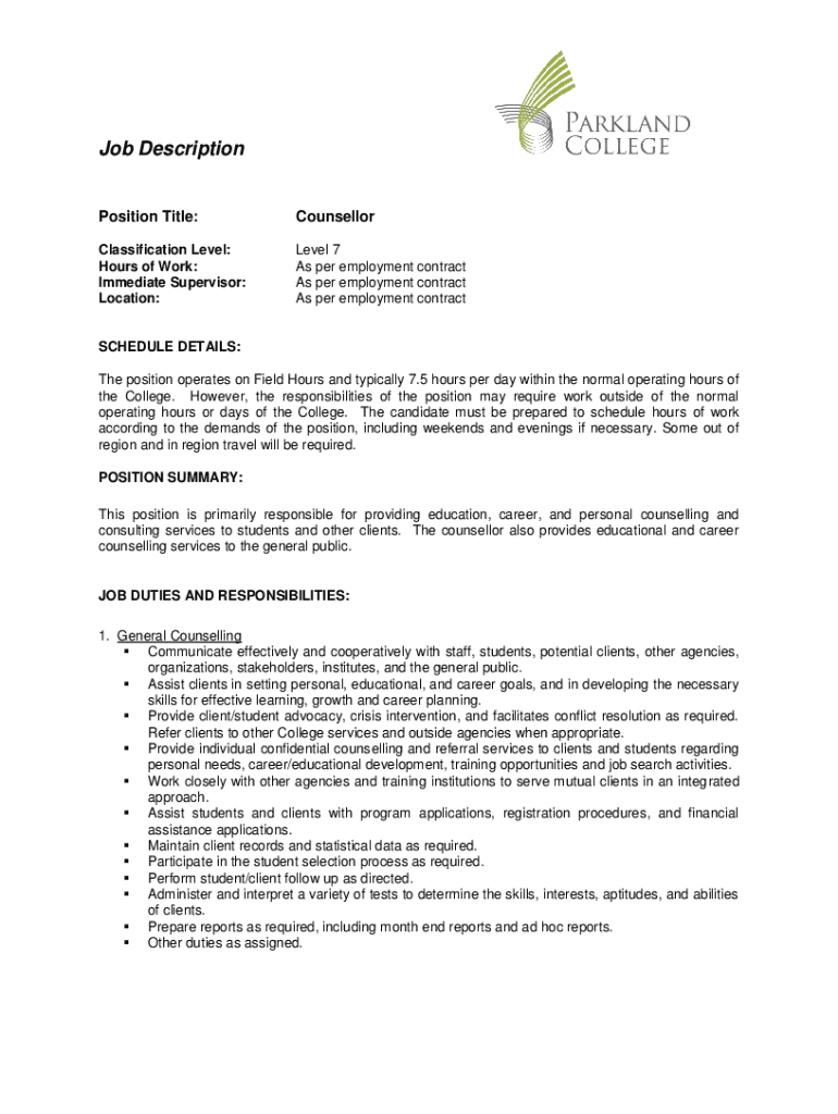 Job DescriptionPosition Title:CounsellorClassification Level: Hours of Work: Immediate Supervisor: Location:Level 7 As per employment contract As per employment contract As per employment contractSCHEDULE