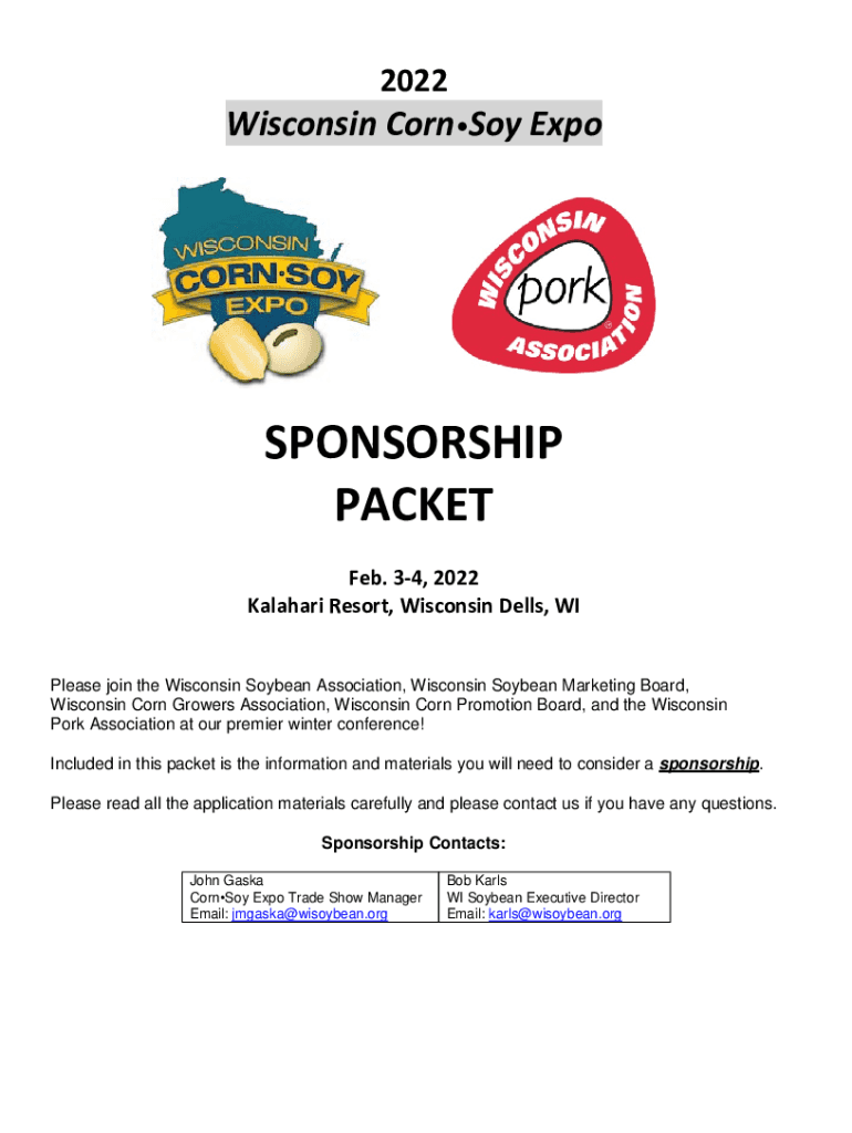 2022Wisconsin Convoy ExpoSPONSORSHIP PACKET Feb. 34, 2022 Kalahari Resort, Wisconsin Dells, WIP lease join the Wisconsin Soybean Association, Wisconsin Soybean Marketing Board, Wisconsin Corn Growers