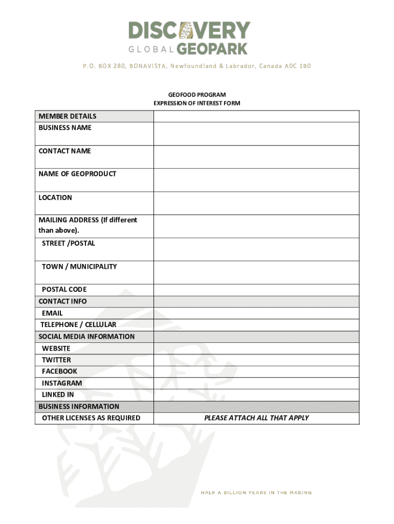 P. O. B O × 2 80, B ON AV IS T A, N e WF o u n d land & Lab r ad or, Can add a A0 C 1 B0GEOFOOD PROGRAM EXPRESSION OF INTEREST REMEMBER DETAILS BUSINESS NAME CONTACT NAME OF BIOPRODUCT LOCATION MAILING