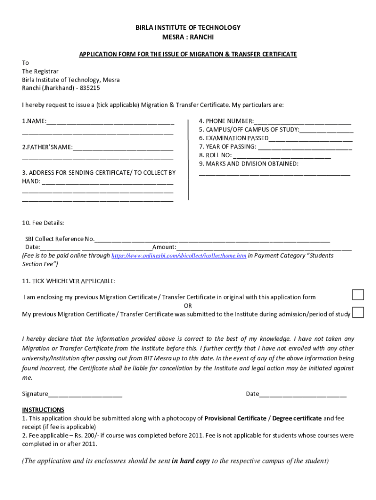 BIR LA INSTITUTE OF TECHNOLOGY MESA : RANCHI APPLICATION FORM FOR THE ISSUE OF MIGRATION & TRANSFER CERTIFICATE To The Registrar Barley Institute of Technology, Mesa Ranchi (Jharkhand) 835215 I hereby