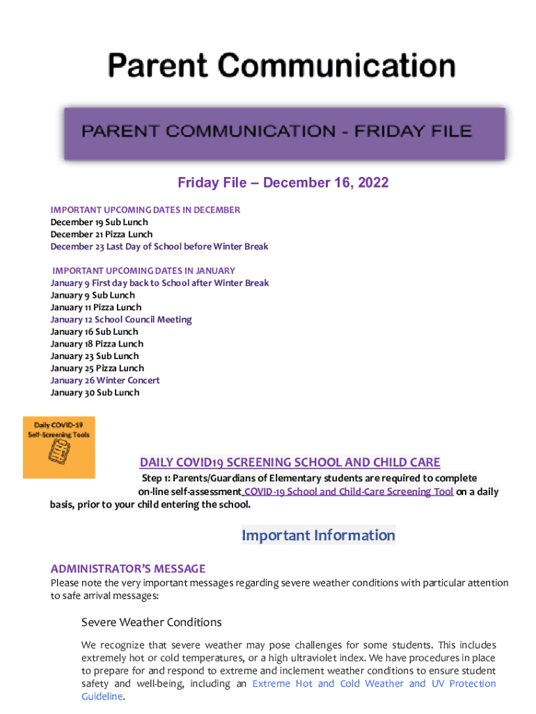 Friday File December 16, 2022, IMPORTANT UPCOMING DATES On DECEMBER 19 Sub Lunch December 21 Pizza Lunch December 23 Last Day of School before Winter Break IMPORTANT UPCOMING DATES On JANUARY 9 First