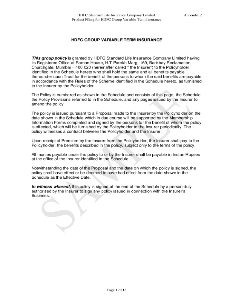 HDFC Standard Life Insurance Company Limited Product Filing for HDFC Group Variable Term InsuranceAppendix 2HDFC GROUP VARIABLE TERM Insurances group policy is granted by HDFC Standard Life Insurance