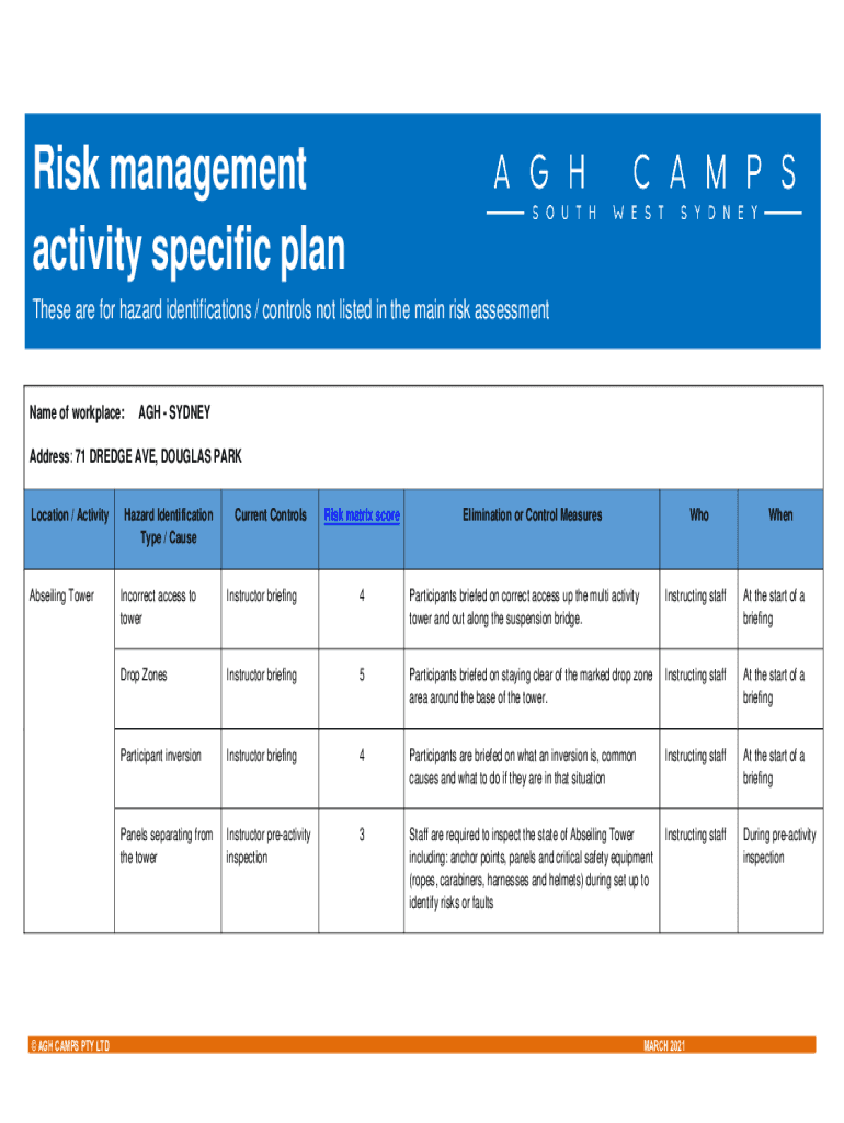 These are for hazard identifications / controls not listed in the main risk assessmentName of workplace:AGH SYDNEYAddress: 71 DREDGE AVE, DOUGLAS PARK