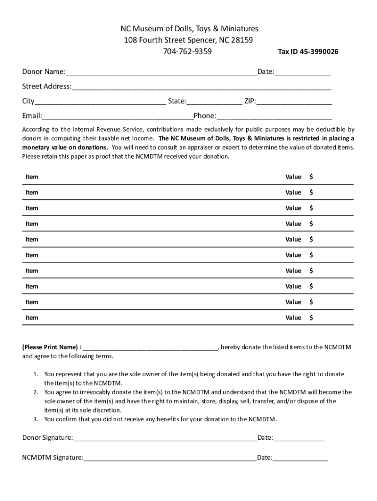 NC Museum of Dolls, Toys & Miniatures 108 Fourth Street Spencer, NC 28159 7047629359Tax ID 453990026Donor Name:___Date:___ Street Address:___ City___ State:___ ZIP:___ Email:___Phone:___ According