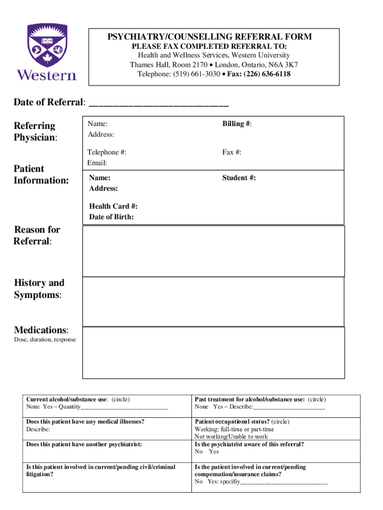 PSYCHIATRY/COUNSELLING REFERRAL FORM PLEASE FAX COMPLETED REFERRAL TO: Health and Wellness Services, Western University Thames Hall, Room 2170 London, Ontario, N6A 3K7 Telephone: (519) 6613030 Fax: