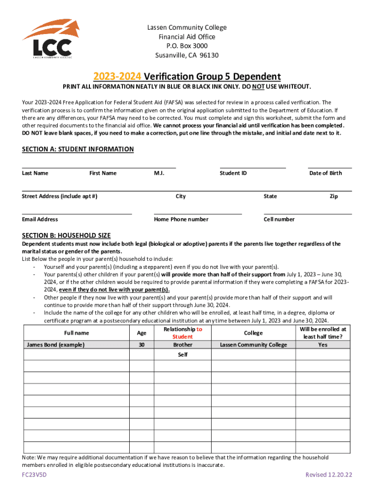 Lassen Community College Financial Aid Office P.O. Box 3000 Danville, CA 9613020232024 Verification Group 5 DependentPRINT ALL INFORMATION NEATLY IN BLUE OR BLACK INK ONLY. DO NOT USE WHITEOUT. Your