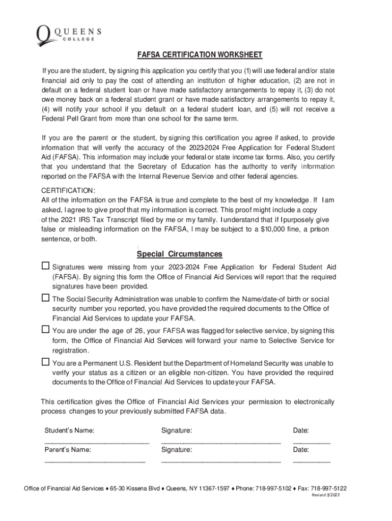 FAFSA CERTIFICATION WORKSHEET If you are the student, by signing this application you certify that you (1) will use federal and/or state financial aid only to pay the cost of attending an institution