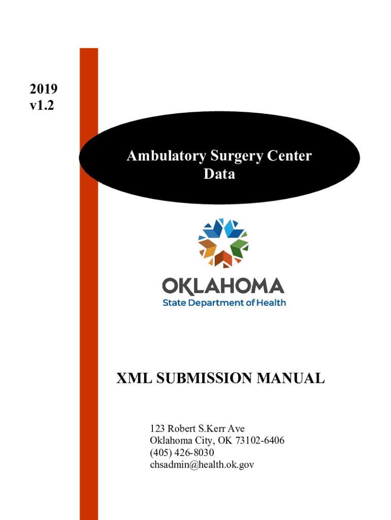 2019 v1.2Ambulatory Surgery Center Data XML SUBMISSION MANUAL 123 Robert S. Kerr Ave Oklahoma City, OK 731026406 (405) 4268030 chsadmin@health.ok.govAT A GLANCE: Changes have been made to the 2019