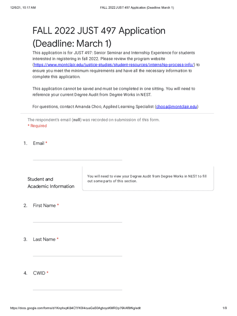 12/6/21, 10:17 AMF ALL 2022 JUST 497 Application (Deadline: March 1)FALL 2022 JUST 497 Application (Deadline: March 1) This application is for JUST 497: Senior Seminar and Internship Experience for