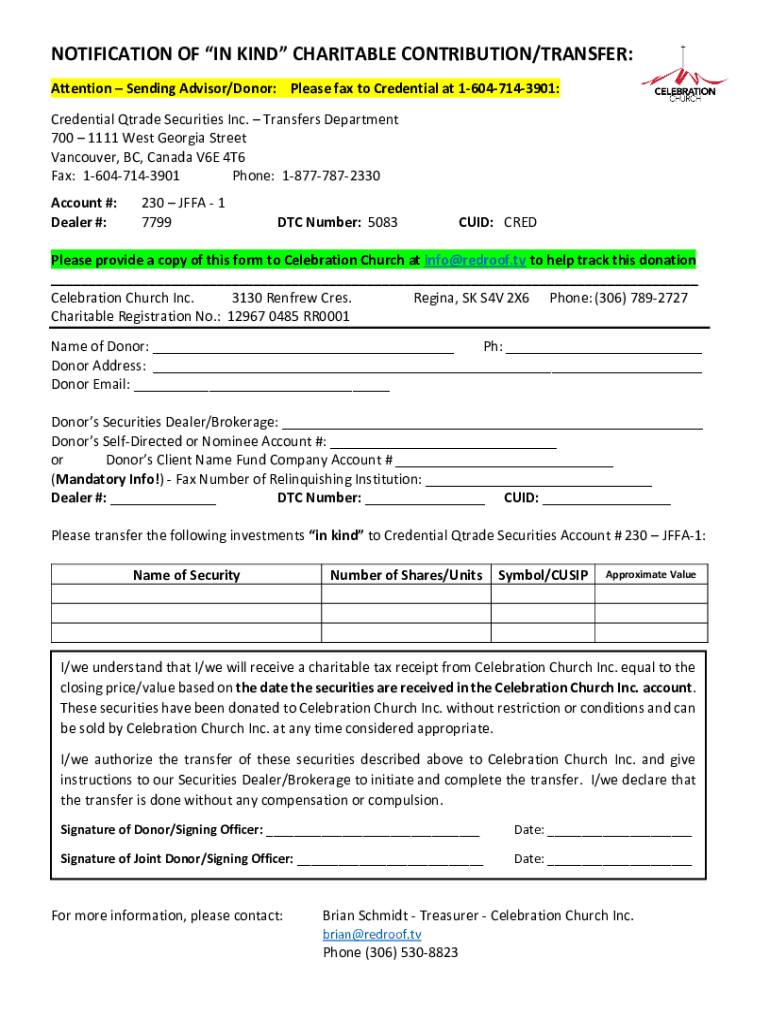 NOTIFICATION OF IN KIND CHARITABLE CONTRIBUTION/TRANSFER: Attention Sending Advisor/Donor: Please fax to Credential at 16047143901: Credential Trade Securities Inc. Transfers Department 700 1111 West