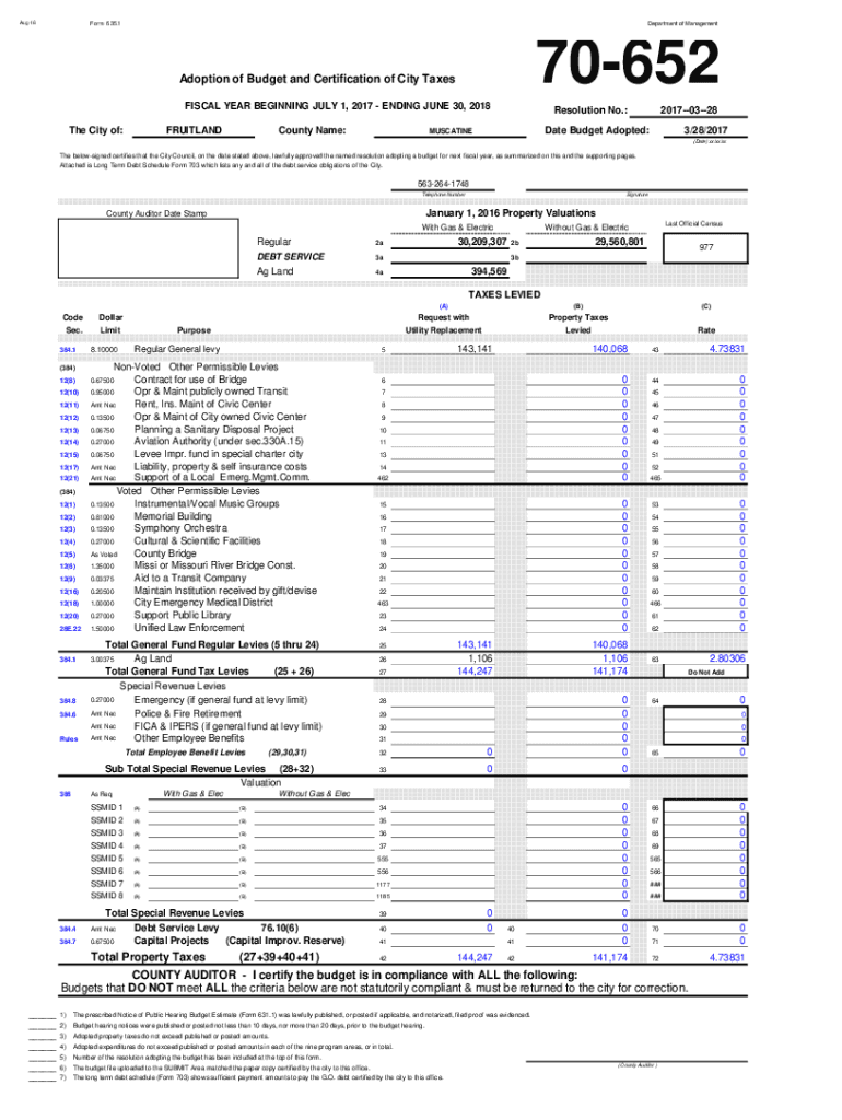 Aug16Form 635.1Department of Management170652Adoption of Budget and Certification of City Taxes FISCAL YEAR BEGINNING JULY 1, 2017, ENDING JUNE 30, 2018, The City of:County Name:FRUITLANDResolution