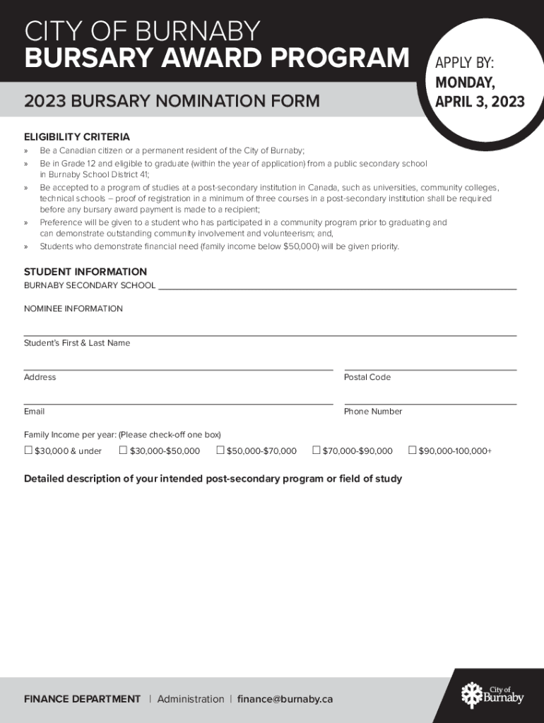 CITY OF BURNABY BURSARY AWARD PROGRAM POLICY Purpose City of Burnaby Council recognizes the importance of a postsecondary education in a students career pursuits and the value of a well trained workforce