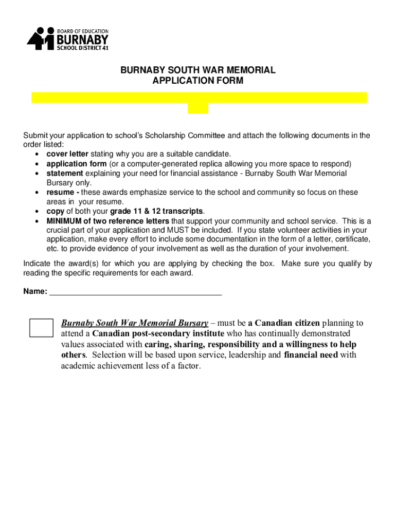 Get the free burnaby south war memorial application form
