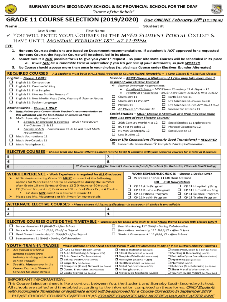 BURNABY SOUTH SECONDARY SCHOOL & BC PROVINCIAL SCHOOL FOR THE DEAF Home of the Belgrade 11 COURSE SELECTION (2019/2020) Due ONLINE February 18th (11:59pm) Name__ ___ Student #: ___ Last NameFirst