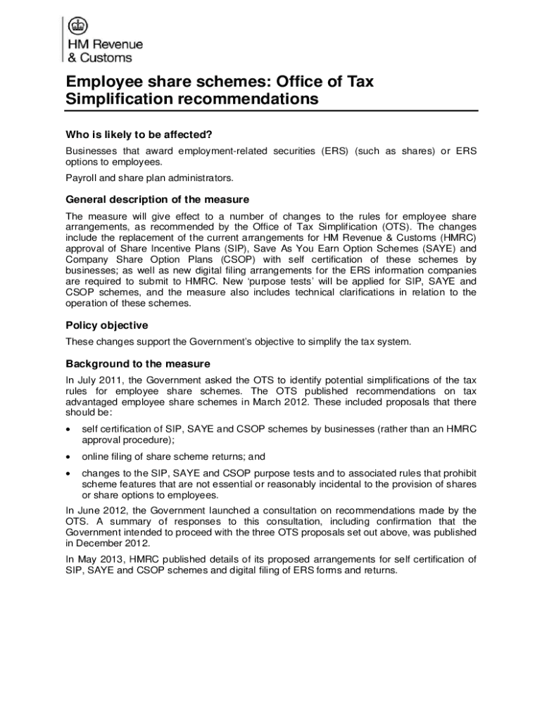 Employee share schemes: Office of Tax Simplification recommendations Who is likely to be affected? Businesses that award employment related securities (ERS) (such as shares) or ERS options to employees.