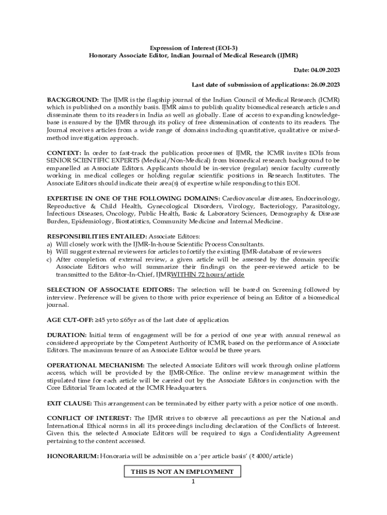 Expression of Interest (EOI3) Honorary Associate Editor, Indian Journal of Medical Research (IJM) Date: 04.09.2023 Last date of submission of applications: 26.09.2023 BACKGROUND: The IJM is the flagship