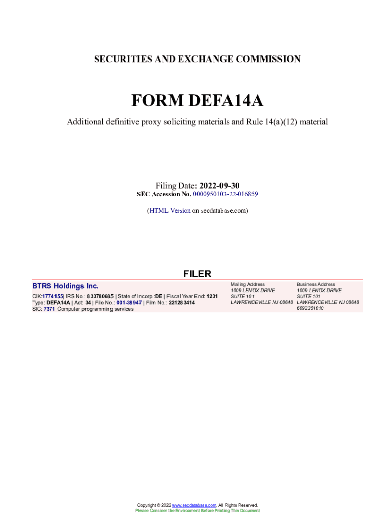 Get the free BTRS Holdings Inc. Form DEFA14A Filed 2022-09-30. Accession Number