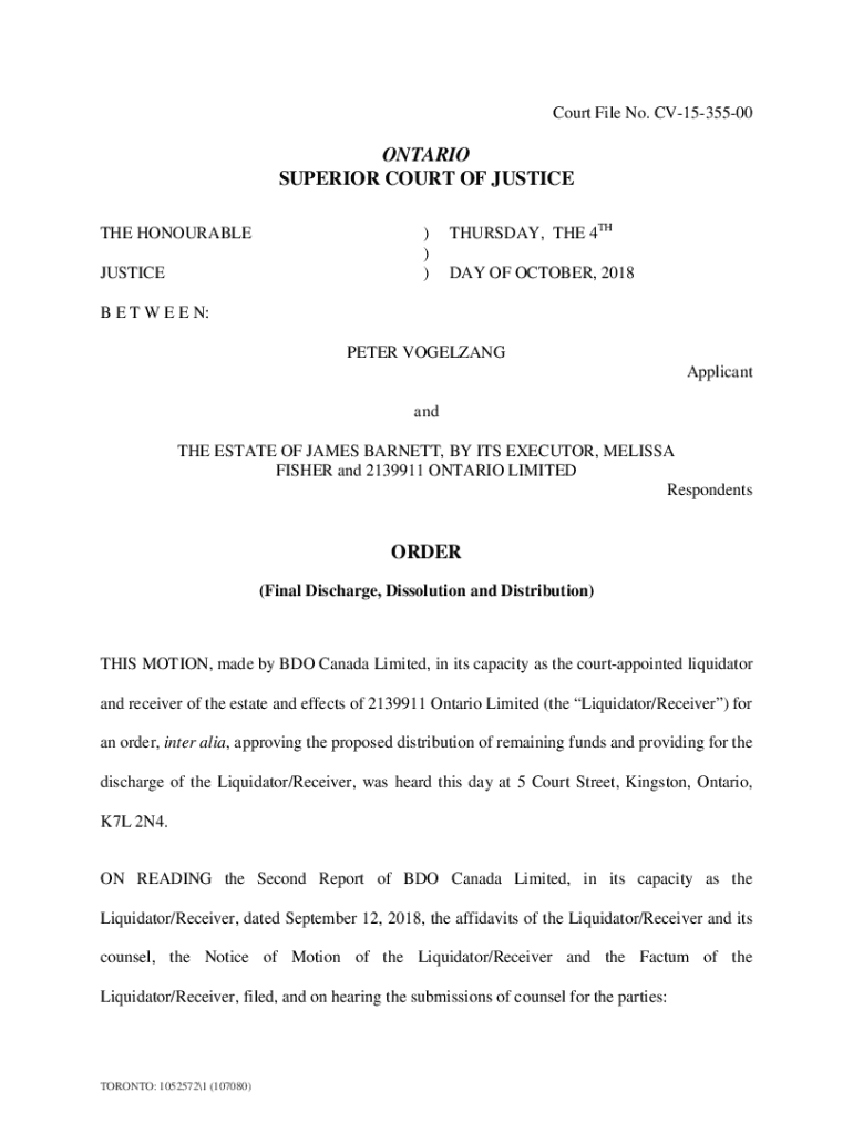 Court File No. CV1535500ONTARIO SUPERIOR COURT OF JUSTICE THE HONORABLE JUSTICE)) )THURSDAY, THE 4TH DAY OF OCTOBER, 2018B E T W E E N: PETER VOWELIZING Applicant and THE ESTATE OF JAMES BARNETT,