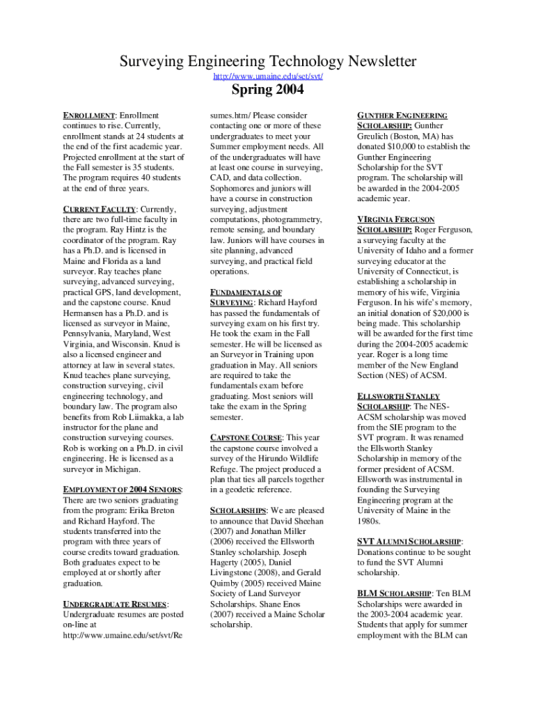 Surveying Engineering Technology Newsletter http://www.umaine.edu/set/svt/Spring 2004 ENROLLMENT: Enrollment continues to rise. Currently, enrollment stands at 24 students at the end of the first