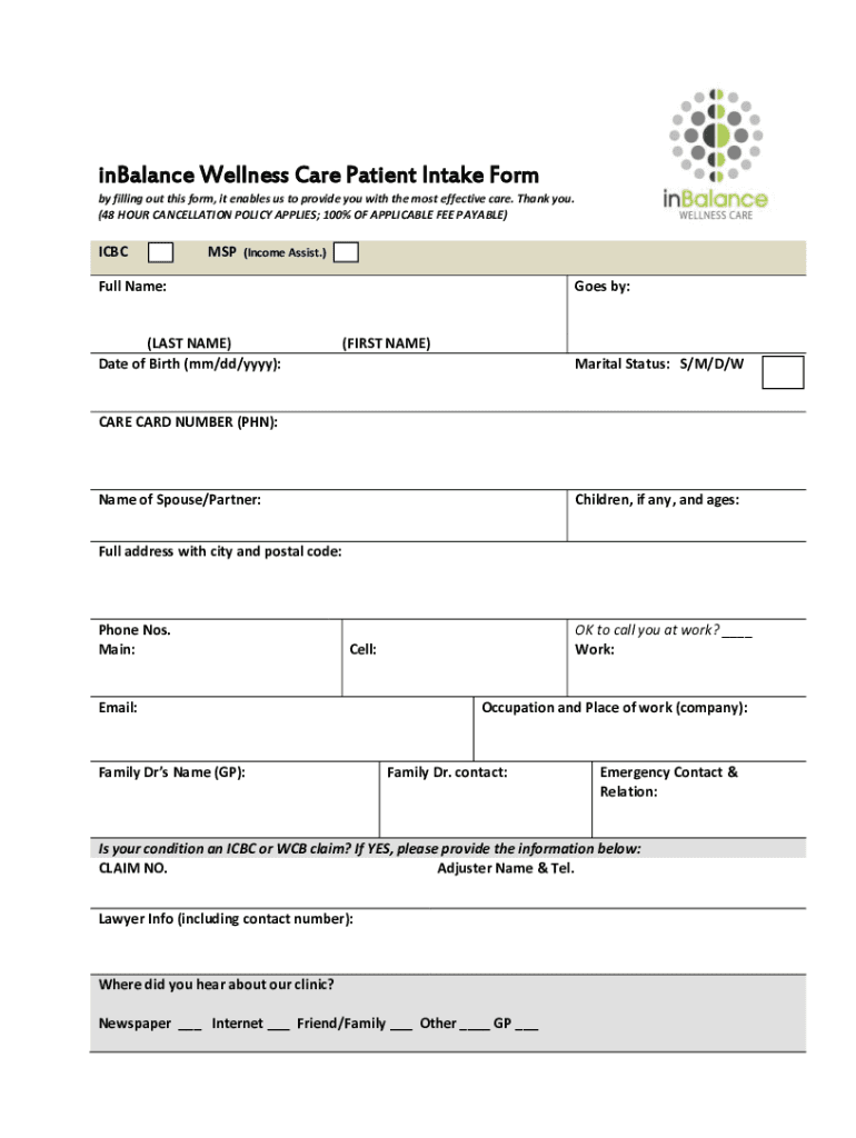 Imbalance Wellness Care Patient Intake Form by filling out this form, it enables us to provide you with the most effective care. Thank you. (48 HOUR CANCELLATION POLICY APPLIES; 100% OF APPLICABLE
