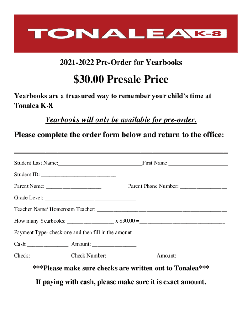 20212022 PreOrder for Yearbooks$30.00 Presale Price Yearbooks are a treasured way to remember your children time at Tonal ea K8. Yearbooks will only be available for preorder. Please complete the