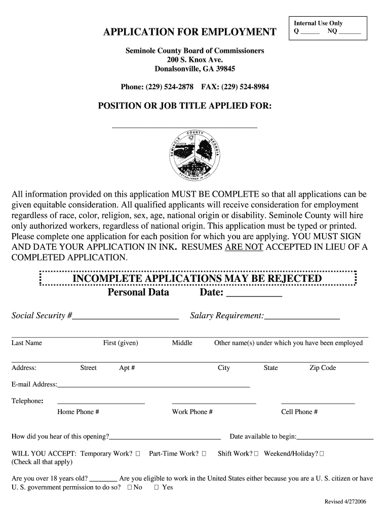 This document serves as an employment application for candidates applying for positions within the Seminole County Board of Commissioners, collecting necessary personal information, employment history,