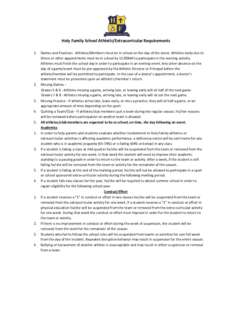 Holy Family School Athletic/Extracurricular Requirements 1.2.3. 4. 5. 1.2.3. 4.1.2. 3. 4. Games and Practices Athletes/Members must be in school on the day of the event. Athletes tardy due to illness