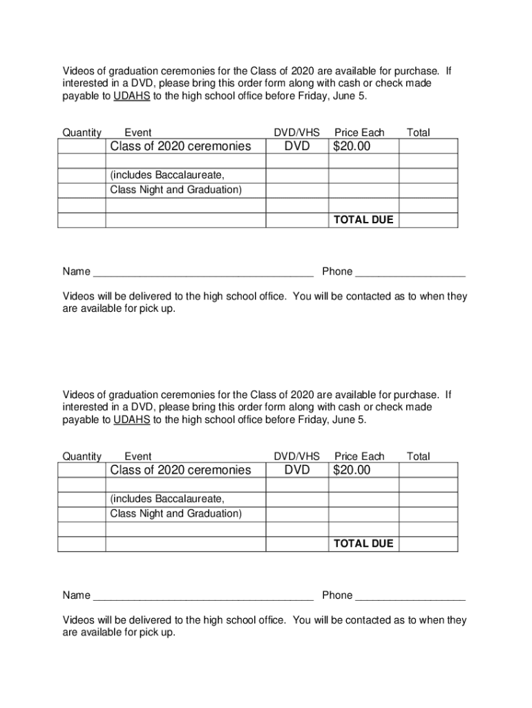 Videos of graduation ceremonies for the Class of 2020 are available for purchase. If interested in a DVD, please bring this order form along with cash or check made payable to DAYS to the high school