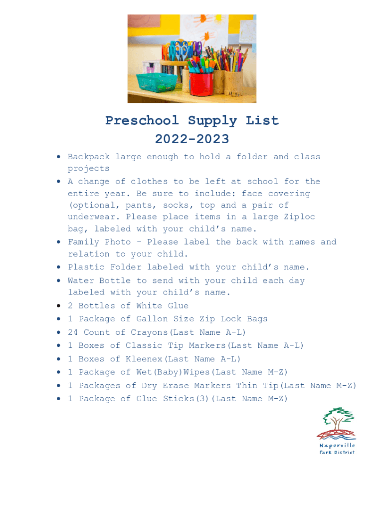 Preschool Supply List 20222023 Backpack large enough to hold a folder and class projects A change of clothes to be left at school for the entire year. Be sure to include: face covering (optional,