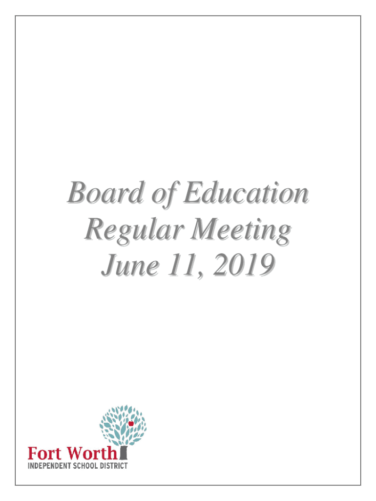 Board of Education Regular Meeting June 11, 2019Regular MeetingNotice is hereby given that on June 11, 2019, the Board of Education of the Fort Worth Independent School District will hold a Regular