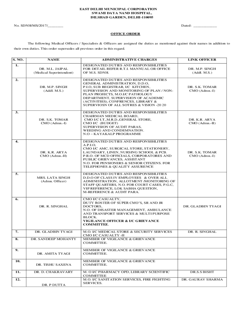EAST DELHI MUNICIPAL CORPORATION SWAMI DAY ANAND HOSPITAL, DISHED GARDEN, DELHI110095 No. SDH/MS/2017/___Dated: ___ OFFICE Order following Medical Officers / Specialists & Officers are assigned the