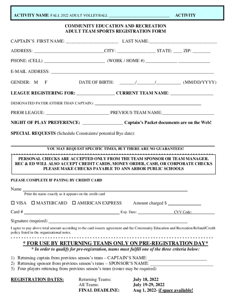 ACTIVITY NAME: FALL 2022 ADULT VOLLEYBALL ___ ID#:___ACTIVITYCOMMUNITY EDUCATION AND RECREATION ADULT TEAM SPORTS REGISTRATION FORM CAPTAINS FIRST NAME: ___ LAST NAME:___ ADDRESS: ___CITY: ___ STATE: