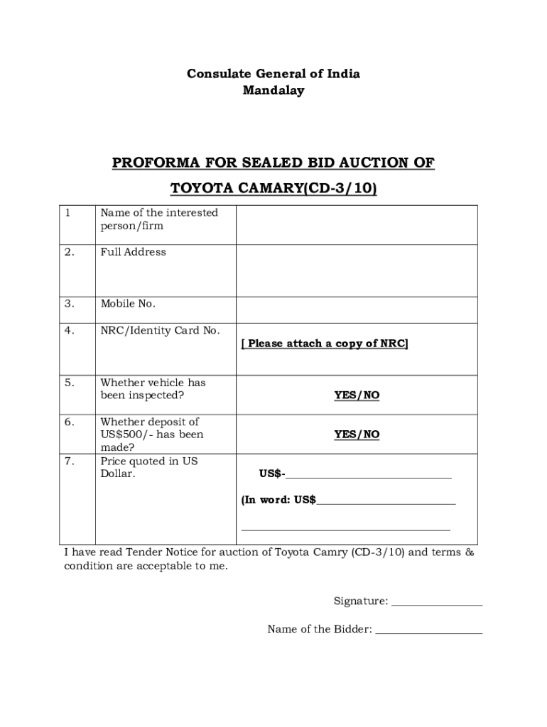 Consulate General of India MandalayPROFORMA FOR SEALED BID AUCTION OF TOYOTA CANARY(CD3/10) 1Name of the interested person/firm2. Full Address3. Mobile No.4.NRC/Identity Card No. [Please attach a