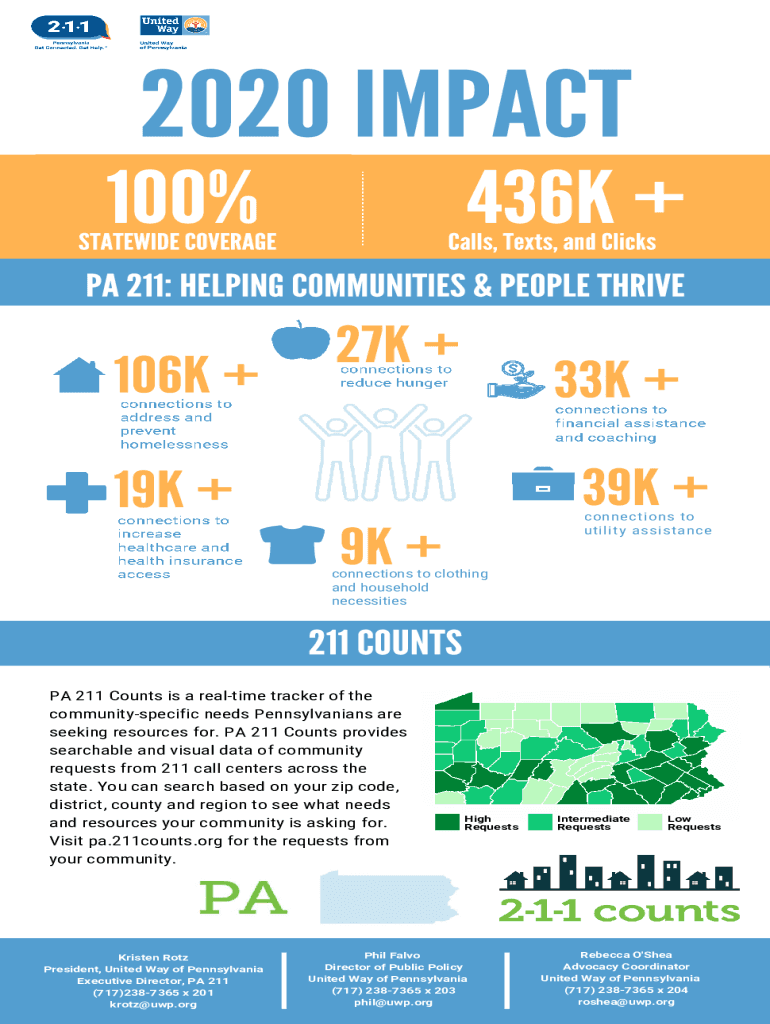 2020 IMPACT 100%436K +STATEWIDE COVERAGECalls, Texts, and Clicks PA 211: HELPING COMMUNITIES & PEOPLE THRIVE27K + 106K +33K +39K +19K +connections to utility assistance9K +connections to clothing
