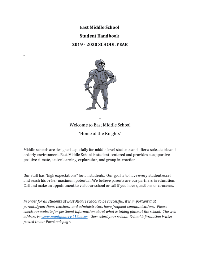 East Middle School Student Handbook 2019 2020 SCHOOL YEARWelcome to East Middle School Home of the Knights Middle schools are designed especially for middle level students and offer a safe, stable