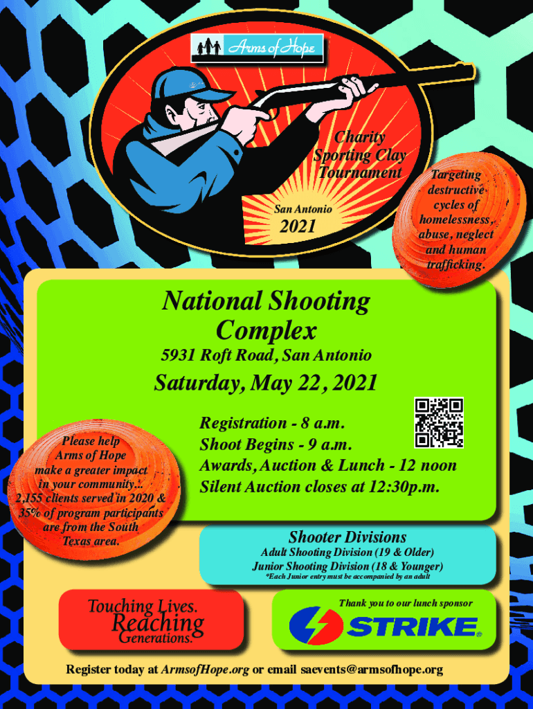 Charity Sporting Clay Tournament San Antonio2021National Shooting ComplexTargeting destructive cycles of homelessness, abuse, neglect and human trafficking.5931 Root Road, San Antonio Saturday, May