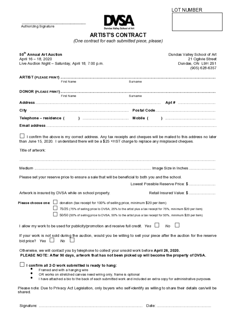 LOT NUMBER ___ Authorizing SignatureARTIST\'S CONTRACT (One contract for each submitted piece, please) th50 Annual Art Auction April 16 18, 2020 Live Auction Night Saturday, April 18, 7:00 p.m. Sundas