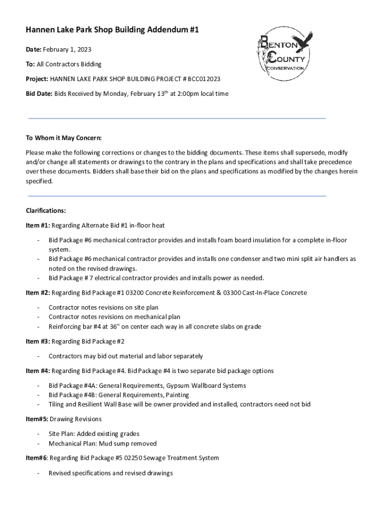 Hansen Lake Park Shop Building Addendum #1 Date: February 1, 2023, To: All Contractors Bidding Project: HANSEN LAKE PARK SHOP BUILDING PROJECT # BCC012023 Bid Date: Bids Received by Monday, February