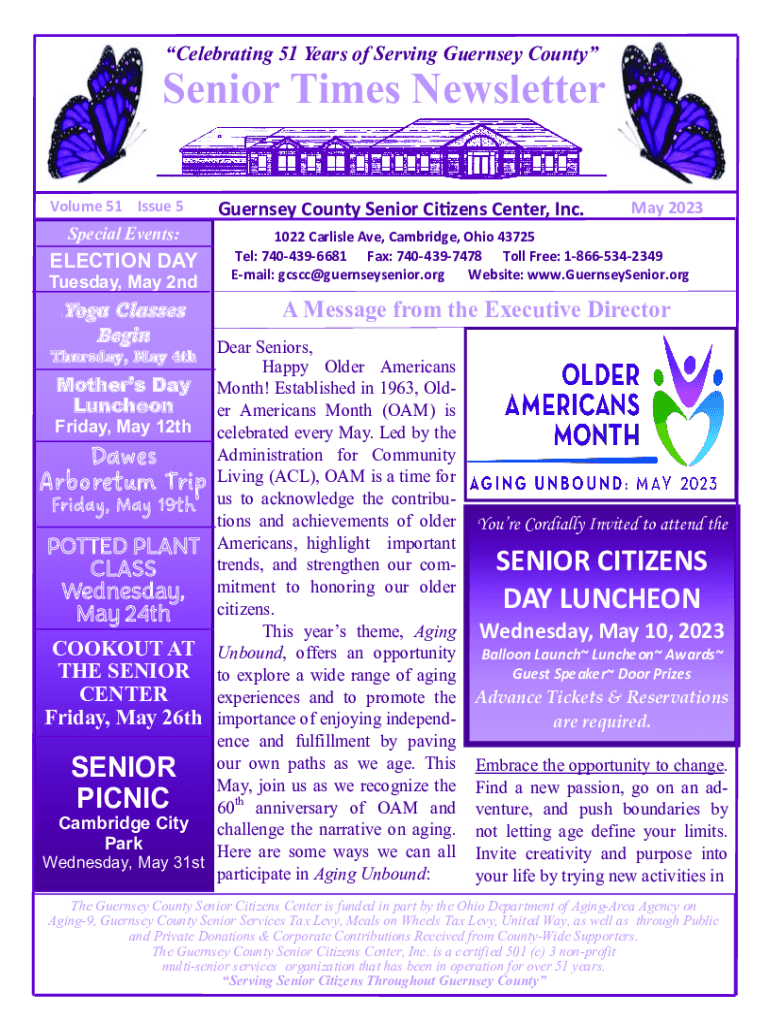 Celebrating 51 Years of Serving Guernsey County Senior Times Newsletter Volume 51 Issue 5Special Events:ELECTION DAY Tuesday, May 2ndYoga Classes Begin Guernsey County Senior Citizens Center, Inc.