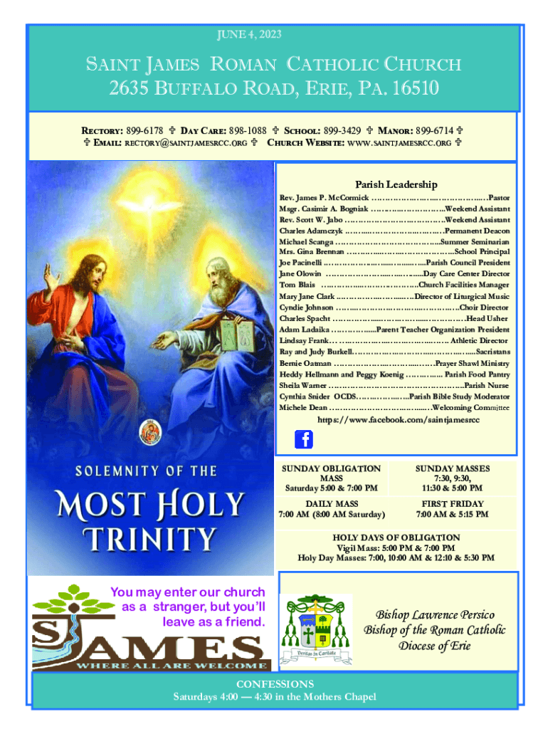 JUNE 4, 2023SAINT JAMES ROMAN CATHOLIC CHURCH 2635 BUFFALO ROAD, ERIE, PA. 16510 Rectory: 8996178 Day Care: 8981088 School: 8993429 Manor: 8996714 Email: rectory@saintjamesrcc.org Church Website: