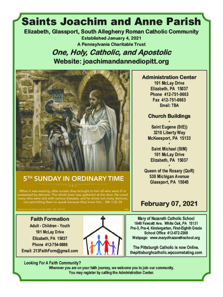Saints Joachim and Anne Parish Elizabeth, Glass port, South Allegheny Roman Catholic Community Established January 4, 2021, A Pennsylvania Charitable Trustee, Holy, Catholic, and Apostolic Website: