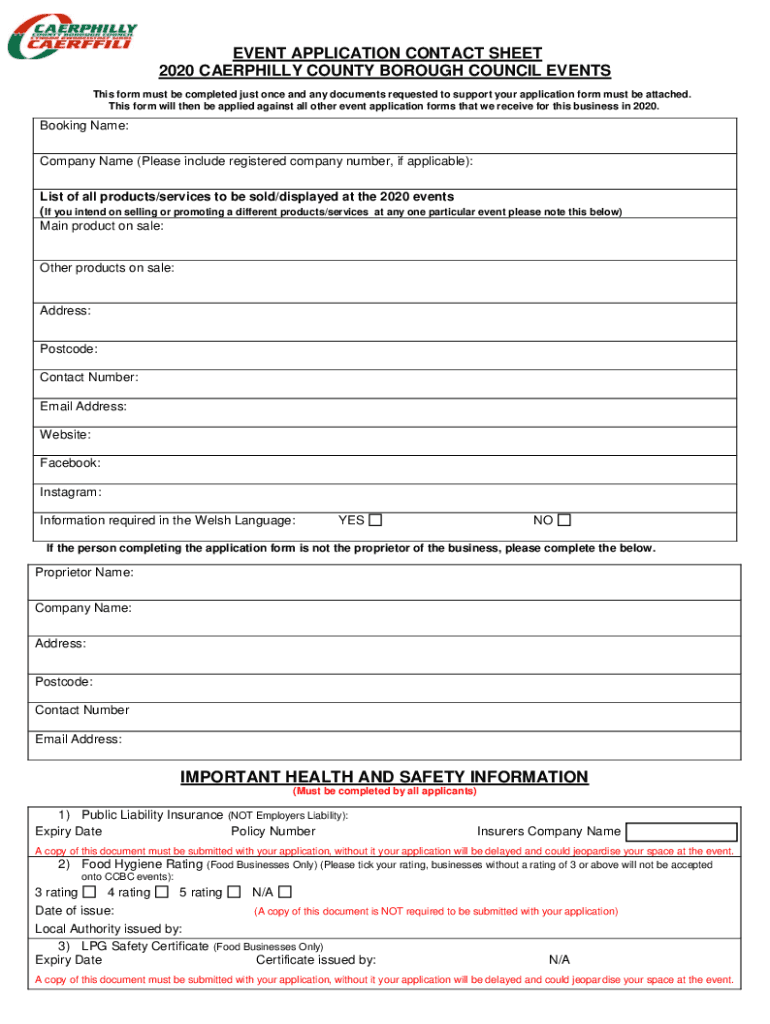 EVENT APPLICATION CONTACT SHEET 2020 CAERPHILLY COUNTY BOROUGH COUNCIL EVENTS This form must be completed just once and any documents requested to support your application form must be attached. This