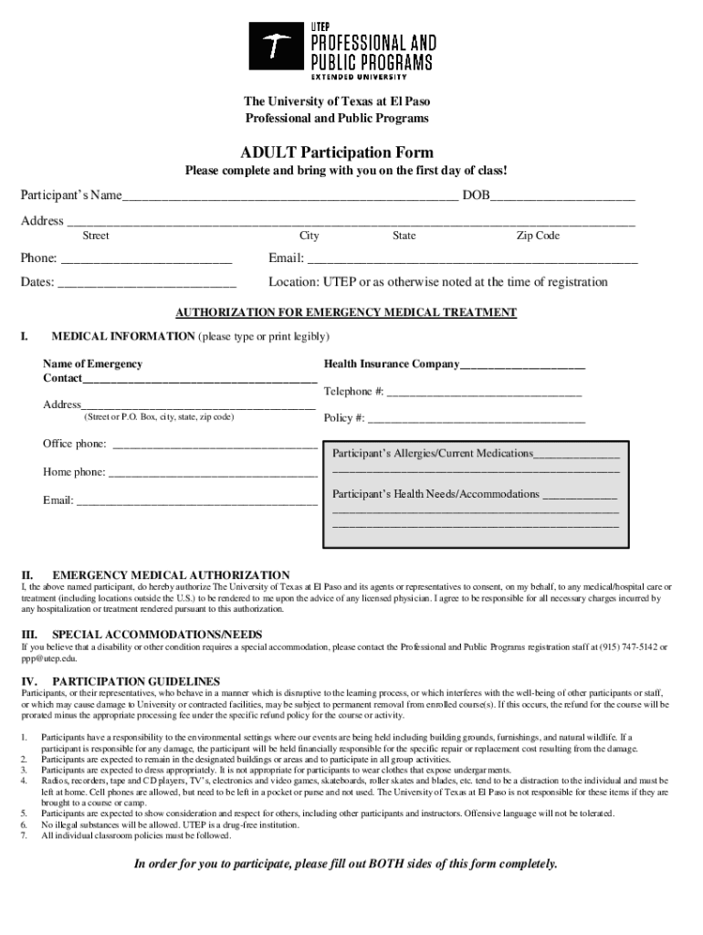 Professional and Public ProgramsADULT Participation Form