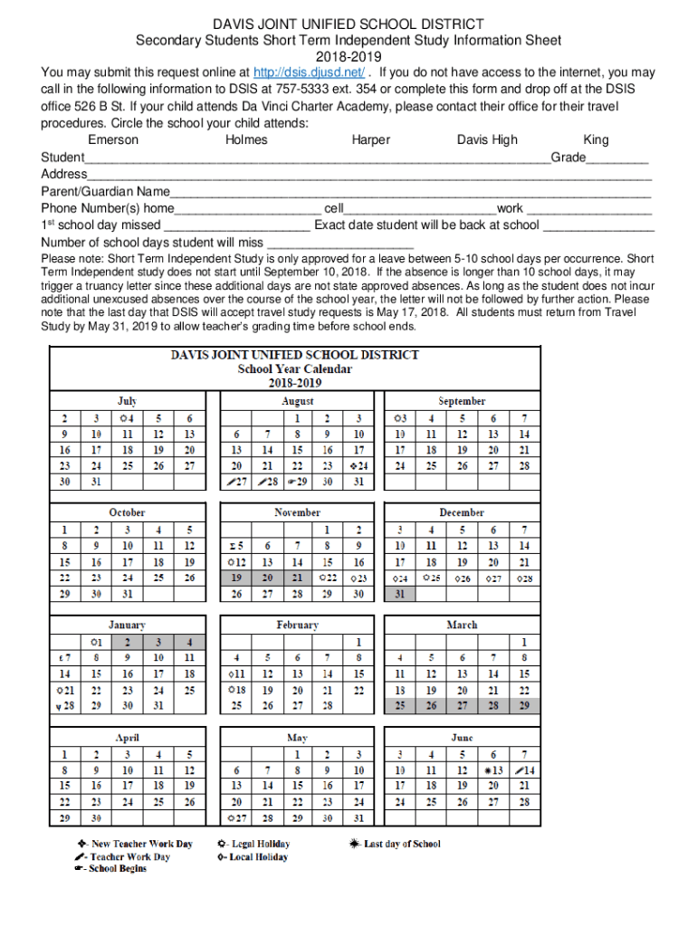 DAVIS JOINT UNIFIED SCHOOL DISTRICT Secondary Students Short Term Independent Study Information Sheet 20182019 You may submit this request online at http://dsis.djusd.net/. If you do not have access