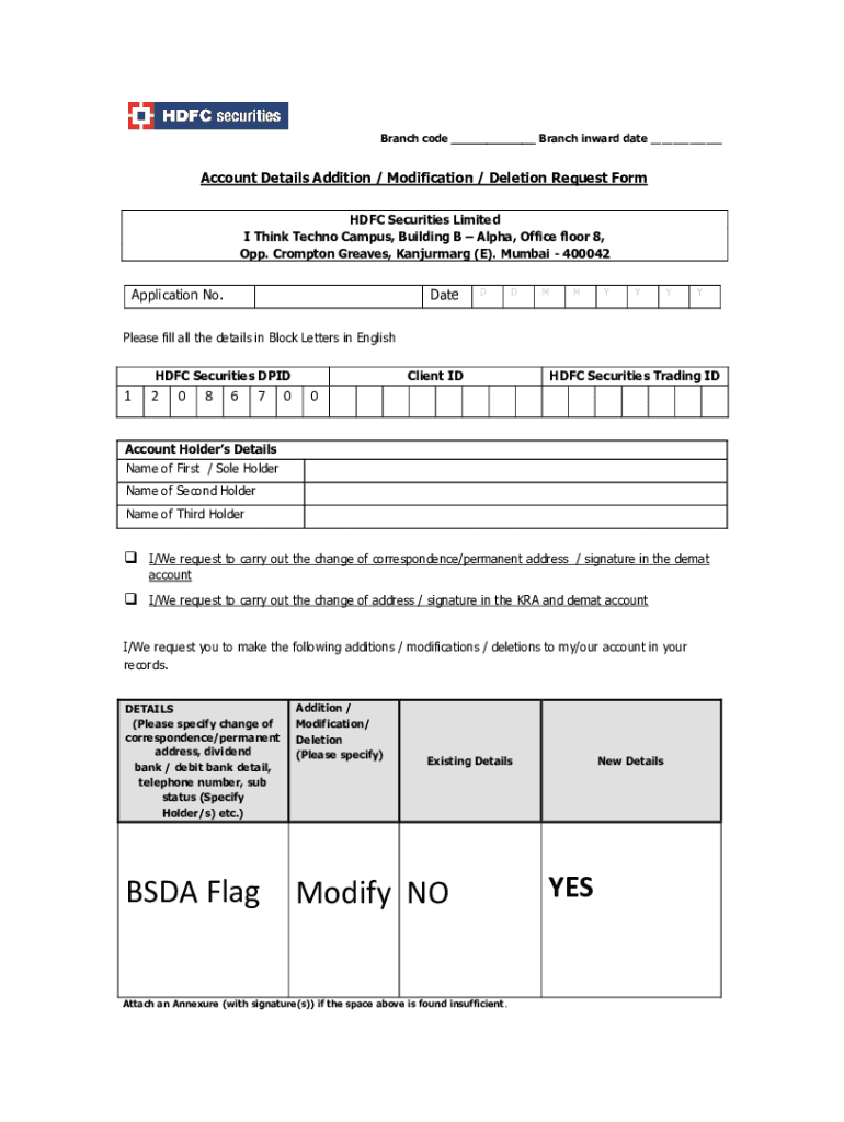 Branch code ___ Branch inward date ___Account Details Addition / Modification / Deletion Request Form HDFC Securities Limited I Think Techno Campus, Building B Alpha, Office floor 8, Opp. Compton