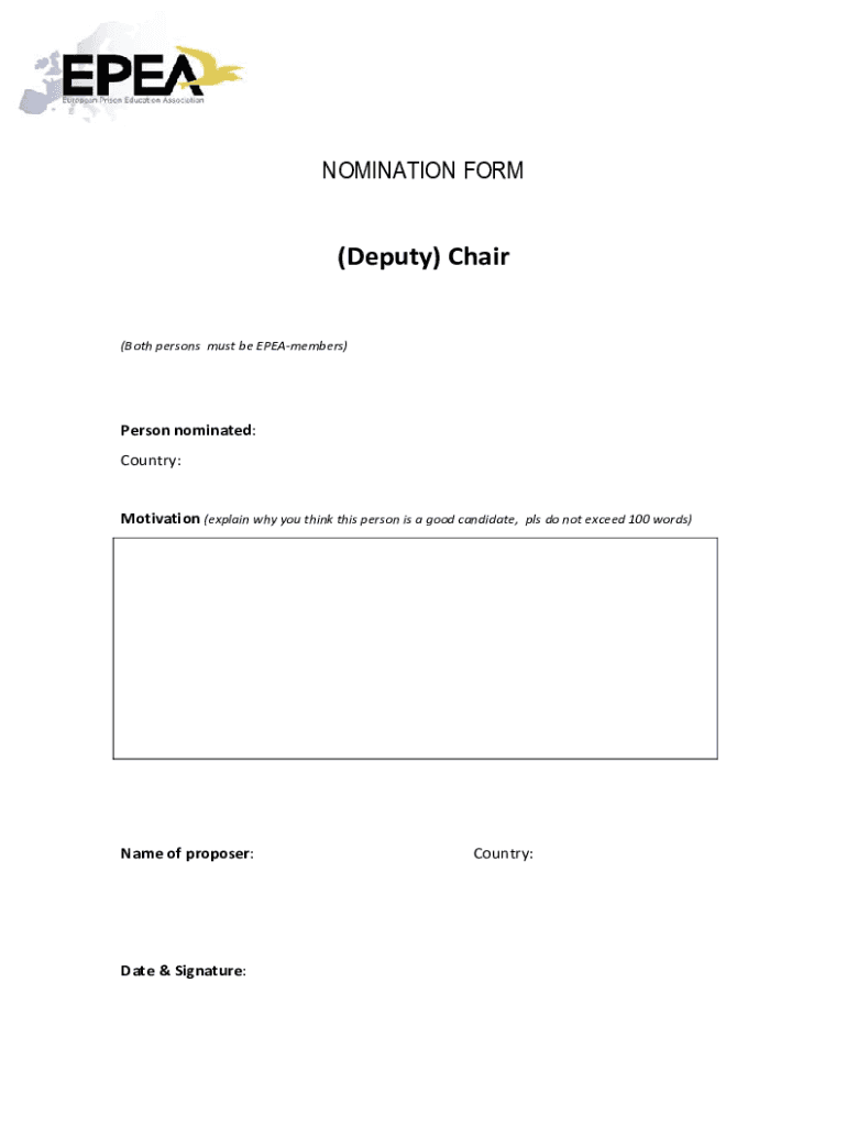 NOMINATION FORM(Deputy) Chair(Both persons must be remembered)Person nominated: Country:Motivation (explain why you think this person is a good candidate, pls do not exceed 100 words)Name of proposer:Date