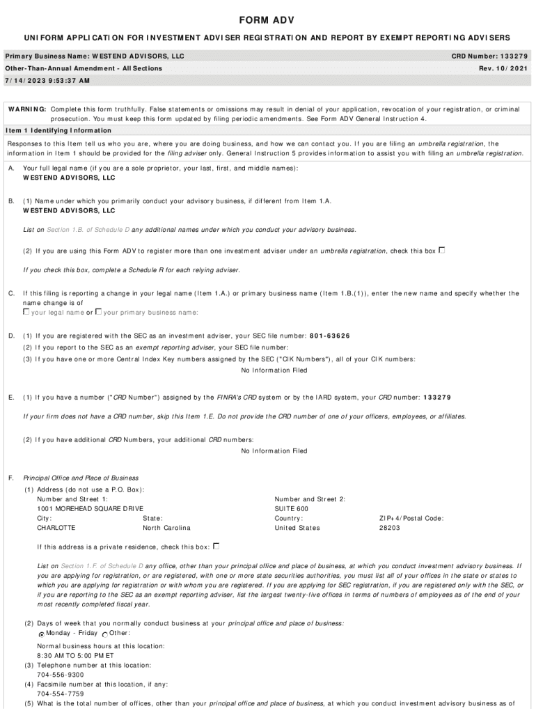 FORM ADV UNIFORM APPLICATION FOR INVESTMENT ADVISER REGISTRATION AND REPORT BY EXEMPT REPORTING ADVISERS Primary Business Name: WEST END Advisers, LLC CRD Number: 133279OtherThanAnnual Amendment All