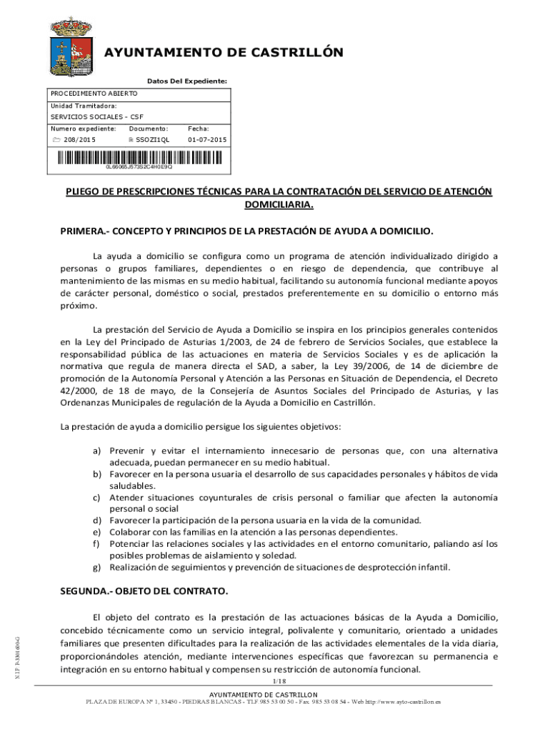 AYUNTAMIENTO DE CASTILLO PROCEDIMIENTO ABIERTODatos Del Expedient:Unidad Tramitadora:SERVICES SOCIALS CSF Number expedient: 208/2015Documento: SSOZI1QLFecha:010720150L66065J573S2C4H0E9Qg 0L66065J573S2C4H0E9Qg