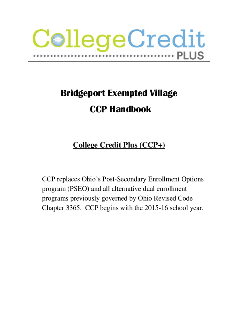 Bridgeport Exempted Village CCP HandbookCollege Credit Plus (CCP+)CCP replaces Ohio's PostSecondary Enrollment Options program (PSE) and all alternative dual enrollment programs previously governed