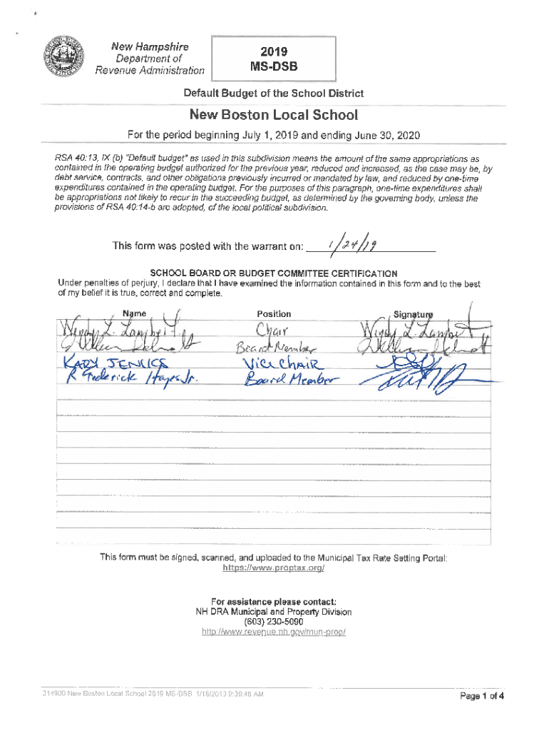 ____________ ___*New Hampshire4? Department of Revenue Administration2019 MSDS Default Budget of the School District Boston Local School For the period beginning July 1,2019, and ending June 30, 2020,